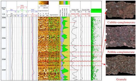 Glutenite reservoirs commonly feature substantial heterogeneity and a complex lithology. The formation’s particle size and the roundness of gravels are keys to judging reservoir physical properties and sedimentary facies [1,2,3,4,5]. Therefore, it is essential to calculate gravel parameters to evaluate glutenite reservoirs accurately. Rock cores can provide rich lithological information, whereas coring is time-consuming, costly, and challenging to execute in multi-well and full-well sections, significantly limiting the precise research of glutenite reservoirs [6]. However, gravel appears to be a two-dimensional feature in images, while conventional logging data are one-dimensional and cannot reflect quantitative characteristics such as the grain size and roundness of the gravel. It is impossible to quantitatively calculate the parameters of gravel using conventional logging data and quantitatively describe the developmental characteristics of the gravel.