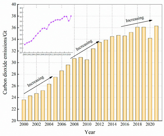 Global climate change has become a common challenge facing all mankind. The increasing temperature, rising sea level, frequent extreme weather, and climate events caused by climate change have become increasingly prominent issues and have evolved from scientific issues to global economic and political issues. The global average temperature has become about 1.1 °C higher than the pre-industrial level in the past few decades. Climate and environmental problems caused by global warming pose a major threat to the earth’s organisms. However, it was not until the 1980s that the problem of global warming, which has its roots in the dramatic increase in atmospheric carbon dioxide emissions, became a widespread concern. In just the last two decades, global CO2 emissions (see Figure 1) from energy combustion and industrial processes have risen from 23.6 Gt in 2000 to the highest level ever recorded in 2021, pushing emissions to 36.3 Gt [1,2,3]. Therefore, strong measures must be taken to control the emission of carbon dioxide into the atmosphere to slow down global warming. Under the goal of “coping with climate change and reducing carbon dioxide emissions”, carbon capture, utilization, and storage technology has become a current research hotspot as an important technical way to achieve the large-scale, low-carbon utilization of fossil energy.