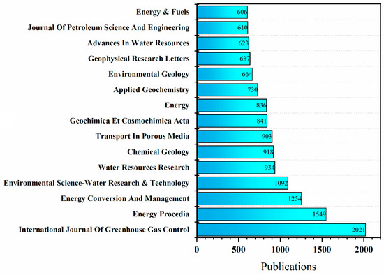 According to statistics, 49 authors published at least six articles among 906 authors, accounting for 5.41%. In terms of the number of publications issued, Tianfu Xu has the largest number, 45, and he is an important authority figure in this field. Tianfu Xu, a professor at Jilin University, has made a series of important achievements in the theoretical and simulation research on the coupling of underground multiphase fluid movement and geochemical migration and proposed a new conceptual model that comprehensively reflects geothermal conduction as well as geological, geochemical, and hydrodynamic conditions. A computer program has been independently developed to simulate the coupling process and mechanism of underground multiphase fluid movement and geochemical migration, which has been applied to the geological disposal of CO2 and nuclear waste, the transport of pollutants, the exploitation and utilization of geothermal energy, etc., and has been increasingly used in petroleum applications. Xiaochun Li is a researcher, doctoral supervisor, and leader of the CO2 geological storage discipline group at the Hubei Key Laboratory of Environmental Geotechnical Engineering, Wuhan Institute of Rock and Soil Mechanics, Chinese Academy of Sciences. He focuses on complex or new rock engineering such as high steep slopes, large-depth underground engineering, and CO2 geological storage. Prof. Xiaochun Li has long been engaged in the research of rock reactions and the auto–flow–mechanics coupling process. Qi Li also from the Hubei Key Laboratory of Environmental Geotechnical Engineering, Institute of Rock and Soil Mechanics, Chinese Academy of Sciences, is mainly engaged in research on energy, environment, and water resources related to energy and waste underground storage, especially in acid gas reinjection (sulfur carbon combined geological storage) and carbon dioxide (CO2) geological utilization and storage (CCUS). His main research fields include elastic wave velocity imaging and the acoustic emission localization of acid gas core displacement, optical fiber monitoring technology and analysis methods for the sedimentary rock seepage process, numerical description and process simulation of chemical–mechanical coupling, site selection of energy and waste underground storage sites, environmental geological risk, and assessment of carbon dioxide/methane/hydrogen sulfide leakage, utilizing the China CCUS Technology Surgical roadmap and ISO-TC265 cross problem. Table 1 shows the top 15 highly productive authors with more than six publications. The data show that these authors are important scholars in this field and have laid a good research foundation. However, all of the authors’ centrality indexes are in the minimal range of 0.00 to 0.01, and the majority have a centrality index of 0. This shows that most of the results of the current research are not highly influential.