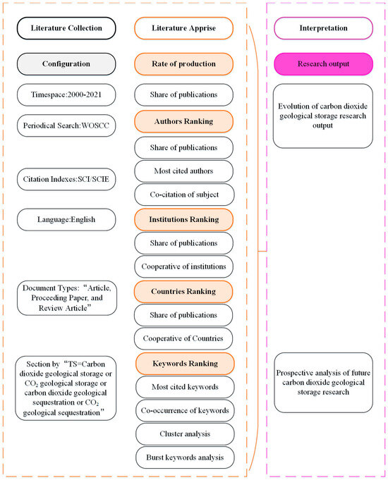 In this work, knowledge graph visualization analysis of CO2 geological storage was performed using CiteSpace (version 5.8.R3), which is a scientific literature data mining and visualization analysis software developed by Prof. Chaomei Chen’s team based on Java language [37]. The analysis process is based on bibliometrics and analyzed by mathematical and statistical methods through cooperative network topology, keyword co-occurrence analysis, and emergent keyword detection. Utilizing the time and space of research on authors, institutions, countries, and hot frontiers, the distribution information of research results in the field, quantitative relationships and the changing pattern of research trends can be obtained.