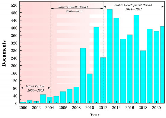 The article output reflects the research results and knowledge active degree for a certain discipline. It is reasonable to judge the social and academic circles’ importance regarding the research in this field through the time series distribution and cumulative output of the article. The number of research results on CO2 geological storage is shown in Figure 4. In general, the research on CO2 geological storage can be roughly divided into three stages. The percentage of articles issued in the three periods are 2.89%, 35.84%, and 61.27%, respectively, and the number of studies in the literature shows an obvious increasing trend.