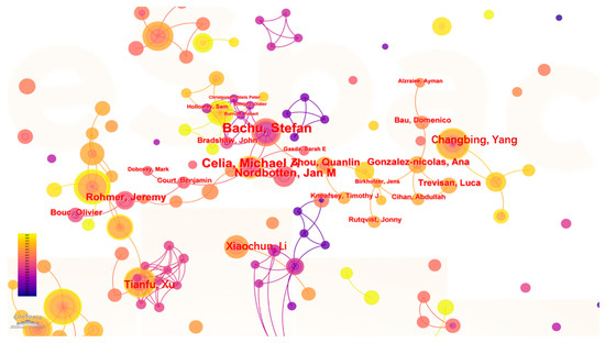 To determine the main authors involved in the study of CO2 geological storage and their cooperation relationships, the author cooperation maps of “Nodes (representing different authors) = 906” as “Links (representing cooperation between two authors) = 1093” were obtained through software processing, as shown in Figure 5. According to Price’s Law [46] proposed by Derek Price, the specific formula is