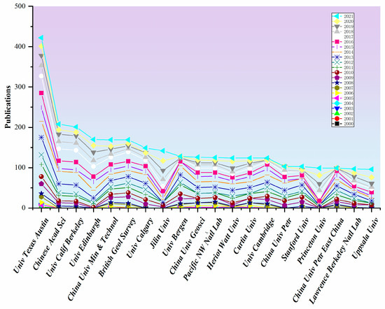Institutions are the disciplinary research resources and professional concentration that have a certain academic influence on the discipline [47]. According to the formula (1), the M value in this study is 16.25, so the minimum number of publications by the core institution is 17. Therefore, it can be concluded that among the 508 global institutions covered in the collected literature, 103 are high-yield institutions, accounting for 20.48% of the total. Table 2 shows the top 20 high-yield institutions with more than 10 publications. Figure 6 shows the published statistics of the top 20 high-productivity organizations in the past 10 years.