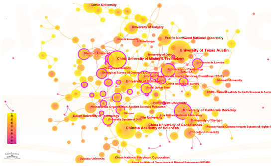 Institutions such as the China University of Mining and Technology, Tsinghua University, the University of Edinburgh, the University of California at Berkeley, and Stanford University are major research centers, and they have close collaborative relationships with many other institutions. These large nodes indicate a relatively high level of research activity in the field and also imply a high level of influence in the field. The University of Texas at Austin has collaborations with eight institutions including Intelligent Opt Syst Inc, Georgia Institute of Technology, Texas A&M University, and Seoul National University [48,49,50,51,52]. The Chinese Academy of Sciences has frequent collaborations with the University of Chinese Academy of Sciences and Ibaraki University [53,54,55]. UC Berkeley works closely with Reykjavik Energy, Yveland University and CSIRO Petroleum [56,57,58,59]. By looking at the color of the nodes, you can see that certain institutions show different levels of activity at different times. For example, some institutions are more active in the early stages and less active in the later stages, and vice versa. This may reflect shifts in research priorities or changes in the allocation of resources. In addition, as the research progresses, new models of cooperation may emerge, and old models of cooperation may change. There are several typical clusters of institutional collaborations, which are analyzed in depth to reveal successful experiences, problems faced, and contributions to the field as a whole. For example, the cooperation between several Chinese universities and the China National Petroleum Corporation and China Petroleum and Chemical Corporation shows the close collaboration between industry and academia, which is crucial for the research and development and practical application of new technologies.