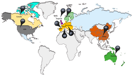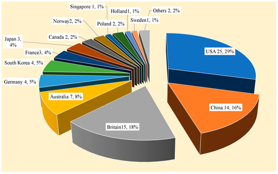 In Figure 7, it is worth noting that the high-yield institute mechanism includes 25 American institutions such as the University of Texas at Austin, University of California at Berkeley, Pacific NW National Lab, University of Cambridge, Stanford University, Lawrence Berkeley National Lab, Princeton University, etc. There are 15 British institutions such as the University of Edinburgh, British Geological Survey, Heriot Watt University, University of London Imperial Coll Science Technology & Med, etc. There are also 14 Chinese institutions such as the Chinese Academy of Sciences, China University of Mining & Technology, Jilin University, China University of Petroleum, etc. It is found that high-yielding institutions in the United States, the United Kingdom, and China account for 63%. It indicates that these three countries take the lead in the research of CO2 geological storage in the world. The specific geographical distribution of each institution is shown in Figure 8.