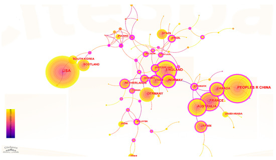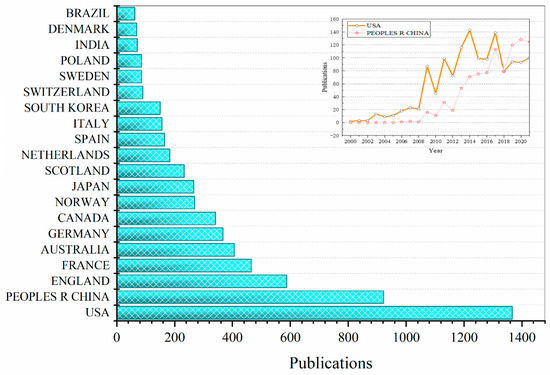 According to Formula (1), among 87 countries, countries with more than 30 papers are defined as high-yield countries. In terms of the article number published by national authors, the USA and China rank first and second with 1367 and 922, respectively. Figure 9 shows the number of articles they have published over the past two decades. These research achievements and attention in the carbon dioxide geological storage field far exceed those of other countries. In this area, they have important and outstanding scholars and researchers, which has laid a good foundation for the developments in this area. It is followed by England (587), Australia (406), France (465), Germany (367), Canada (341), Norway (269), Japan (266), Scotland (233), the Netherlands (183), Spain (165), etc. They also play an important role in the carbon dioxide geological storage. Denmark (0.75), Norway (0.57), Romania (0.46), Italy (0.42), Brazil (0.40), and Malaysia (0.40) have centrality index values greater than 0.4. It shows that these countries have a great influence on this research field and form an influential bridge role. From a geographical point of view, the core countries are mostly the United States, China and northern Europe. These countries tend to be good models of economic, scientific, and cultural power, and its impact will also radiate to neighboring countries as carbon storage research output increases.