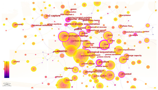 Keywords are the most representative field terms chosen by the author for the completed scholarship and reflect the focus of the research results. Keyword frequency analysis is the statistical data given by the authors on the frequency of occurrence of the same keyword. The higher the frequency of the words, the more the research field pays attention to the keywords. The co-occurrence analysis of keywords is a statistical analysis of the frequency of occurrence of author keywords in pairs. The more frequently a keyword pair appears, the higher the original similarity of the two keywords. A clustering algorithm is used in CiteSpace to further normalize the co-occurrence intensity. The analysis of word frequency and keyword co-occurrence in academic papers can objectively and accurately reflect the distribution structure of hot topics and themes in the research field. The co-occurrence network of keywords obtained using CiteSpace for the CO2 geological storage study is shown in Figure 12.