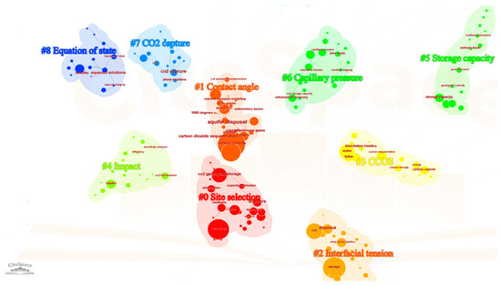 The cluster names are extracted based on 788 keywords, and through the filtering function of CiteSpace, the clusters with less than 10 clusters are filtered out to display the main clusters, as shown in Figure 13. The clustering module value (Modularity, Q > 0.3) and the average silhouette degree (Weighted Mean Silhouette, S > 0.7) reflect the clarity of the keyword clustering boundary and the clustering scale, respectively. In the map, Modularity Q = 0.8302, Weighted Mean Silhouette S = 0.9409, indicating that all 10 clusters passed the clustering test, and the clustering structure was significant. The CO2 storage potential of the sequestering geologic body is influenced by its scale, sealing property, burial depth, porosity, permeability, temperature, pressure, ground stress, hydrology and other geological conditions, as well as technical, economic, and policy measures, which is highly consistent with the current clustering results.
