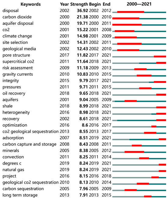 The top 30 highlighted words are shown in Figure 14, and the highest highlighted word are “disposal, carbon dioxide and aquifer disposal”, which indicate that the injection of CO2 into the brackish water layer has been a hot research issue in the field of CO2 geological storage. This direction focuses on the study of CO2 transport in the subsurface brackish water layer, the analysis and evaluation of the geological conditions of the subsurface brackish water layer, and the estimation of CO2 storage capacity. For example, Yamamoto et al. [80] developed a two-dimensional reactive transport model for long-term CO2 geological storage, Bachu et al. [81] studied the injection of deep saline aquifers and storage in salt caverns, and Damen et al. [82] assessed the risk posed by subsurface CO2 storage (CO2 and CH4 leakage, seismicity, ground motion, and brine displacement).