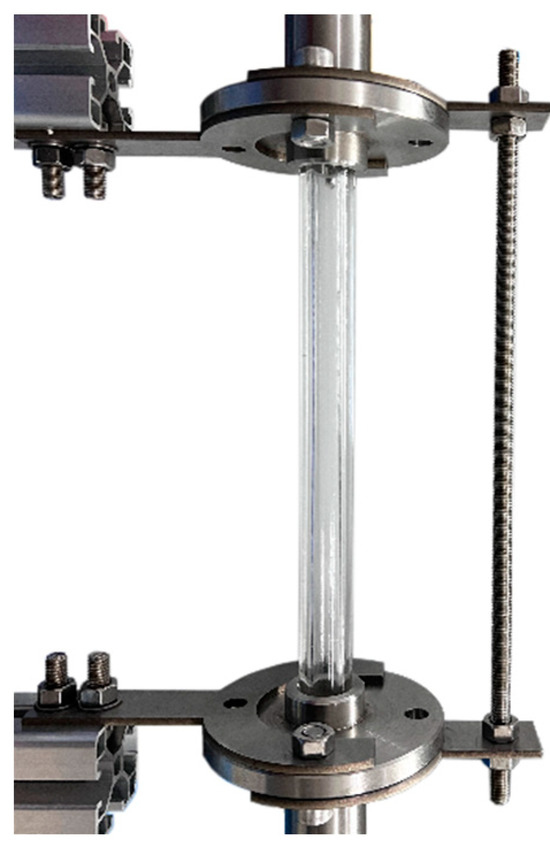 As shown in Figure 1, our constructed scavenge pipe visualization test system successfully captured the two-phase flow pattern images inside the vertical tube under different flow conditions. We must ensure that the pipe’s lubricant reaches the target temperature. Therefore, the system first heats the lubricant in the tank to raise the essential temperature. Second, the lubricant inflows the oil heating controller with temperature feedback for precise heating to ensure that the outlet temperature meets the expectation. At the same time, the oil flow into the mixer is finely regulated by a fluid flow controller (Meikong, Hangzhou, China). Compressed air generated by the compressor passes through a gas canister to the gas heating controller, which can heat the gas to the set temperature. A gas flow controller (Shoukeshihua, Beijing, China) regulates the air volume entry of the mixing device. The gas–oil mixer will uniformly mix the oil–gas flow and send it to the visualization pipe. As illustrated in Figure 2, the pipeline is vertically upward, with a pipe diameter of 10 mm and length of 200 mm, with temperature measurement points at both ends. The visualization component was crafted from robust quartz glass of superior strength, which facilitates the photographic apparatus X190 to record the movement. The camera (Qianyanlang, Hefei, China) has a resolution of 1280 × 1024, shooting 9300 fps to meet the test accuracy requirements. Under the action of the oil and gas separation device, the gas-free slippery oil enters the oil tank, completing the closed loop of the experimental system. The physical properties of the air and oil used are detailed in Table 1.