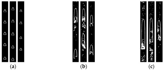 The physical model of this paper is shown in Figure 2; the diameter of the pipe is 10 mm, the length of the visualized pipe is 200 mm, the medium used in the pipe is air and oil, and the flow direction is a vertically upward flow. Respectively, we changed the pipeline gas–liquid two-phase inlet flow for test simulation, used the high-speed camera to shoot the flow with a shooting frame rate of 5000 fps, and set the two-phase mixing temperature of 370 k for each group of tests to ensure the liquid-phase discounted speed for the unchanged scenario and, in turn, to increase the inlet flow rate, sequentially shooting the pipe flow photographs and resulting in the flow changes as shown in Figure 3. For better flow analysis of the bubbles, the photographs were binarized to observe the edges and shapes of the bubbles more clearly and to facilitate further analysis of their flow characteristics.