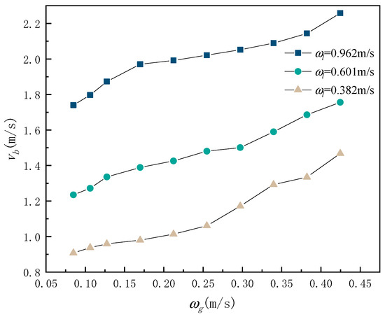 As shown in Figure 6, the liquid-phase conversion speed was unchanged for the apparent bubble velocity changes in the pipe. As the gas-phase conversion rate increased, the speed of bubbles gradually increased, and the gas-phase conversion speed of 0.17 m/s before the growth rate of the bubble velocity became more extensive. Then, the growth rate became flat. The discounted velocity of the gas continued to increase, and after reaching 0.32 m/s, the growth rate of the bubble velocity rose again. Longitudinally, looking at the apparent bubble velocity change graph in the tube, in the case of a constant inlet volume, the bubble velocity increased further with the increase of the liquid-phase converted velocity.