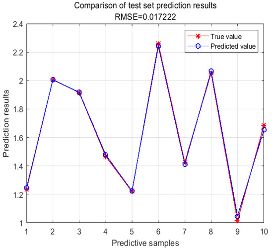 The bubble-flow characteristics-prediction model was established, respectively, with the converted velocity of gas–liquid two-phase flow as the input of eigenvalue and the apparent flow velocity of bubbles as the output of target parameter, with 80 sample data in the training set and 10 test samples. Figure 8 shows that the prediction results are promising, with the root mean square error RMSE = 0.0172, and the model prediction error is less than 5%. The model achieves the design expectations and shows that combining machine learning with in-pipe bubble-flow analysis is highly rewarding. The current work has made significant progress in predicting the flow characteristics of bubbles in tubes, and this improvement in predictive capability is vital for both engineering practice and academic research. Moving forward, our research will focus on further improving the generalization capability of the prediction model to a broader range of flow regimes. Specifically, we expect to optimize the model structure and algorithms to accurately capture and evaluate the complex oil–gas flow conditions in the scavenge pipe.