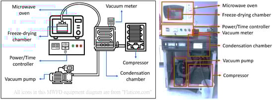 The microwave freeze-dryer was assembled in the laboratory, and its appearance is shown in Figure 1. It included a microwave supply oven, a 2 L glass vacuum drying dish, a vacuum pump (0.1–1 torr), a condensation chamber, a compressor (−20 °C), a vacuum monitor, and a controller (for controlling microwave output power and output time). The equipment used and the provenances were as follows: a constant temperature water bath (B201; Firstek, New Taipei, Taiwan), a gas chromatograph (Varian GC-3400, Woonsocket, RI, USA), a vortex mixer (Vortex-Genie® 2; Scientific Industries Inc., New York, USA), a spectrophotometer (CT2700; ChromTech, Tokyo, Japan), a vacuum filtration pump (Rocker 300; Rocker Scientific Co., Ltd., New Taipei City, Taiwan), a homogenizer (SilentCrusher M; Heidolph, Burladingen, Germany), a microwave digestion system (MARS; CEM, Matthews, NC, USA), a heater (PC-420D; Coring Inc, Corning, NY, USA), a colorimeter (Color Flex; Hunter Lab, Reston, VA, USA), and an oven (Channel DCM-45, Sci-Mistry Co., Ltd., Yilan, Taiwan).