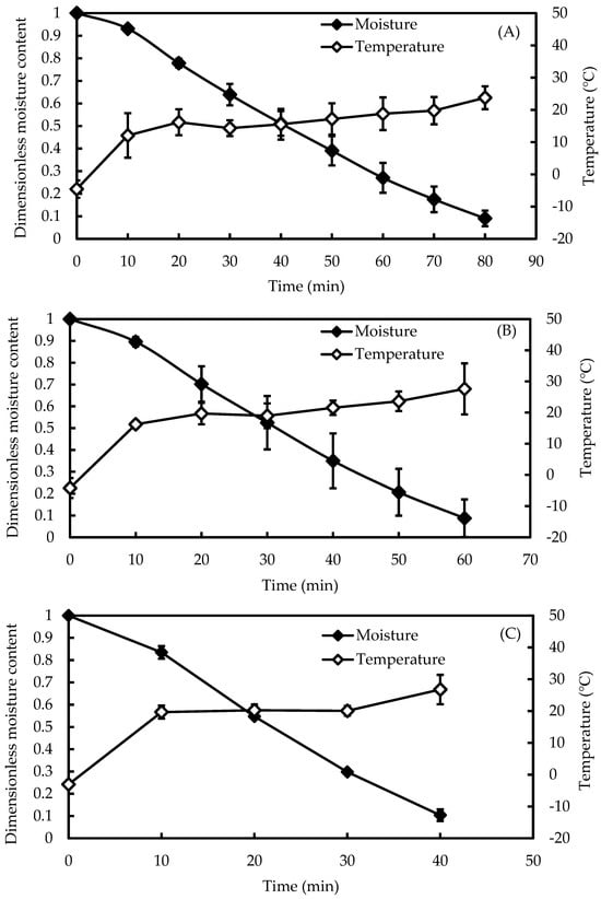 Over the past 30 years, several studies have investigated microwave-assisted freeze-drying of food products, pharmaceuticals, and antibodies. However, most of these studies were conducted using laboratory-scale setups. The primary goal of these studies was to identify appropriate microwave freeze-drying conditions or pretreatment methods to reduce drying time while maintaining good product quality. Examples include studies on strawberries [] and pineapples []. Furthermore, there have been studies on the changes in the structure and properties of food tissues during the microwave freeze-drying process [,,]. Effective moisture diffusivity coefficients have been calculated in microwave freeze-drying or conventional freeze-drying, following Fick’s second law of diffusion [,]. Wang and Shi [] introduced a numerical study on mass and heat transfer during the microwave freeze-drying process. Despite these studies, the use of drying kinetics to explore microwave freeze-drying processes has rarely been mentioned.