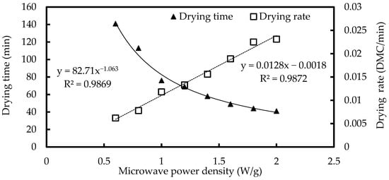 Furthermore, the drying rate increased with the rise in microwave power, from 0.0118 min−1 at 1 W/g to 0.0225 min−1 at 1.8 W/g, nearly doubling the drying efficiency. A comparison was made between the microwave power density and the drying rate (Figure 4). The results showed a linear relationship between microwave power density (x, (W/g)) and drying rate (y, (min−1)), represented as y = 0.0128x − 0.0018, R2 = 0.9872. Using these two sets of equations, the drying rate and drying time at various microwave output powers may be calculated for a given krill sample load weight.