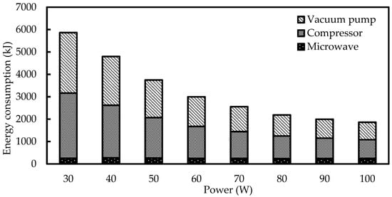 During the drying process, an electrical power monitor (SPG-26MS, Son Dar Electronic Technology Co., Ltd., Taoyuan, Taiwan) was installed at the power source to record the power changes of each energy-consuming unit, including the microwave oven, the vacuum pump, and the compressor. The power changes of the vacuum pump and the compressor over time are shown in Figure 2. Since the power of both stabilized within 10 min, the power values used after stabilization were 345 W for the vacuum pump and 320 W for the condenser. Therefore, the total energy consumed could be calculated by multiplying the total drying time for each energy-consuming unit.