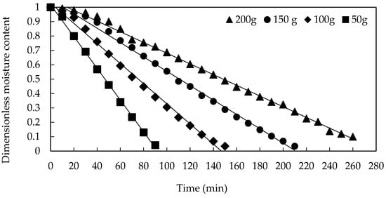 Figure 6 shows the effect of sample weight on the microwave freeze-drying trend of krill at a constant microwave power (50 W). The results showed that as the weight of krill increased (50–200 g), the time required to reach the drying endpoint also increased (83–250 min). This result corresponds with the findings of Wang et al. [] for microwave freeze-drying of instant vegetable soup (150–600 g). Under a fixed microwave power (450 W), when the weight of the vegetable soup increased, the drying time also extended from 3.5 h to 6.5 h. This is because, as the sample load weight increased while the microwave power remained constant, the microwave absorption power per unit weight decreased from 1 W/g to 0.25 W/g.