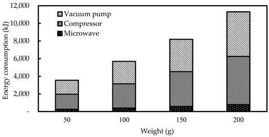 The microwave freeze-drying time predicted with the formula was used to calculate the energy consumed by krill of various weights at the drying endpoint (DMC < 0.1). Figure 7 shows that as the weight (50–200 g) increased, so did the drying time and the total energy loss (3575–11,356 kJ). The compressor and the vacuum pump were responsible for 48% and 45% of the overall energy consumption, respectively, while the energy consumption of the microwave oven accounted for only 7%.