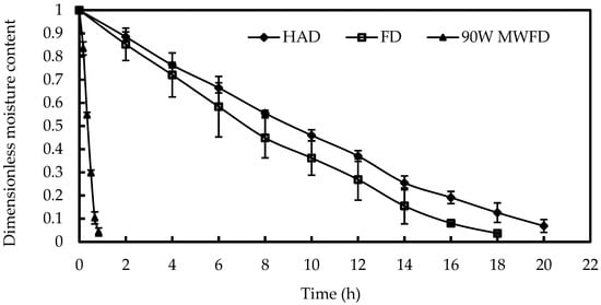 The drying curve during the drying process of 50 g krill by hot-air drying (HAD), freeze-drying (FD), and 90 W microwave drying (MWFD).