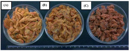 Photos of krill dried by FD (A), MWFD (B), and HAD (C).