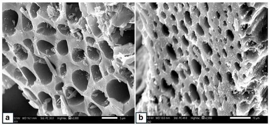SEM images of the microstructure of the biochar surface at two different zones: (a) anterior vessels, and (b) lateral vessels.