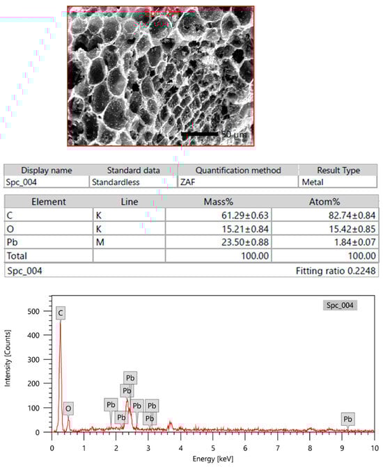 In Figure 2, the EDX analysis image of the biochar after Pb(II) adsorption is shown, highlighting a specific section marked with a red circle. This analysis reveals the elemental composition of the biochar, where carbon, oxygen, and lead are identified as the predominant elements. The high carbon content, a result of the pyrolysis process, is indicative of the transformation of organic matter into a carbon-rich material. The presence of carbon (C) and oxygen (O) in significant amounts suggests the formation of various functional groups, such as C=C (carbon–carbon double bonds) and C-O (carbon–oxygen bonds), which are crucial for the adsorption process. The integration of these results—the microstructure observed through SEM and the elemental composition determined by EDX—provides a comprehensive understanding of the biochar’s properties. The porous microstructure enhances the surface area available for adsorption, while the presence of specific functional groups contributes to the chemical interactions necessary for effective contaminant removal.