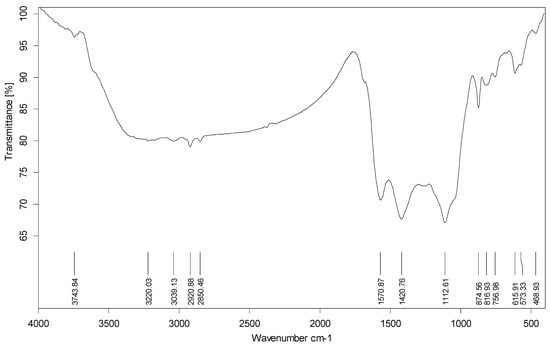 In our analysis of the biochar surface before Pb(II) adsorption using FT-IR spectroscopy, as shown in Figure 3, we identified a range of functional groups integral to the biochar’s adsorptive characteristics. The observed stretching vibrations of the O-H group, notably in the range of 3220–3743 cm−1 [], are associated with hydrogen-bonded O-H groups commonly found in carboxylic and phenolic compounds. These functional groups are crucial in the biochar’s ability to form hydrogen bonds, a key interaction in the adsorption process. Moreover, the presence of C-H (methyl) groups, observed in the range of 2850-2920-3039 cm−1 [], suggests aliphatic substitution on aromatic rings. This structural feature enhances the hydrophobic nature of the biochar, facilitating the adsorption of non-polar substances. The peak detected around 1570 cm−1, indicating the ring stretching of C=C [], further confirms the presence of aromatic compounds. This characteristic is essential for the biochar’s π–π interactions, contributing to its high adsorptive capacity. Aliphatic C-H groups, evidenced by bands at 1420 cm−1 [], add another layer of complexity to the biochar’s chemical structure. Additionally, peaks in the range of 1112 cm−1, corresponding to stretching C-O groups in phenolic compounds, alcoholic compounds, and carboxylic acids [], underscore the biochar’s ability to adsorb metal ions due to its polar nature. The biochar’s lignocellulosic origin is reflected in the observed O-H hydrogen bonds and C-H bonds, typically derived from cellulose, and the C=C bonds resulting from lignin aromatic rings []. The presence of these components implies that the biochar retains structural elements from its biomass precursor, enhancing its adsorption properties. C=O bonds, indicative of carboxylic or carbonyl groups [], play a vital role in the biochar’s capacity to chelate metal ions. This functionality is particularly relevant for heavy metal adsorption. Furthermore, the presence of inorganic matter, as suggested by bands in the range of 468–615 cm−1 [], such as carbonates, can influence the biochar’s overall adsorption capacity. Finally, the C-H aromatic out-of-plane bands [] suggest a high degree of aromaticity, a feature that contributes to the biochar’s adsorptive performance.