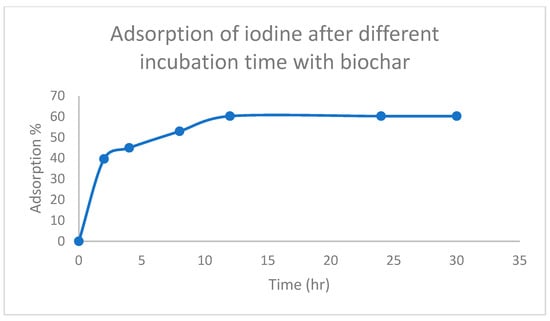 To delve deeper into the adsorption dynamics, we extended our investigation to the impact of incubation time. Figure 5 illustrates the variation in iodine adsorption as the incubation period with 0.4 g of biochar was extended from 2 to 30 h. An interesting pattern emerged: extending the incubation time from 2 to 12 h resulted in an increase in adsorption efficiency, from 40% to 60.3%. This increment underscores the importance of sufficient contact time for the adsorption process, allowing for more extensive interaction between iodine molecules and the biochar.