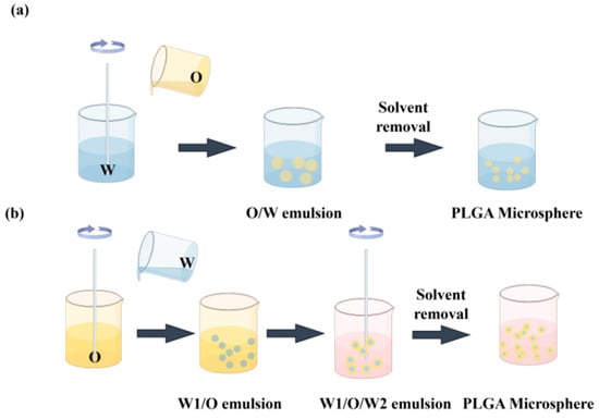 Schematic representation of PLGA microspheres prepared through (a) single emulsion preparation and (b) the double emulsion method. “O” represents the organic solvent phase of the water-insoluble component. “W” represents an aqueous solution containing an emulsifier, which is the medium in which the PLGA solution is emulsified.