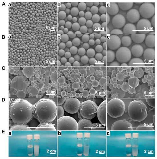 (A) Preparing PLGA microcapsules using a premixed membrane emulsification method. Lidocaine @ PLGA microcapsules prepared with (B) and without (C) a premixed membrane emulsification method were observed via electron microscopy at (A) 1000×, (B) 3000×, or (C) 5000×. (D) Morphological changes in Lidocaine @ PLGA microcapsules after sonication. (E) Optical photographs of 3 mg/mL lidocaine @ PLGA microcapsules with (right) and without (left) premixed membrane emulsification after standing in water for (a) 0 h, (b) 6 h, and (c) 12 h. Reprinted from ref. [46] under the terms and conditions of the Creative Commons Attribution (CC BY) license (http://creativecommons.org/licenses/by/4.0/). https://doi.org/10.3389/fbioe.2022.1072205 (accessed on 24 November 2023).