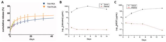 (A) Cumulative triamcinolone (TAA) release from PLGA and PEA microspheres in PBS buffer. The release concentration of TAA in PBS medium was determined via HPLC over the entire 42-day period. For each polymer, three batches were used as technical replicates. Reprinted from ref. [71] under the terms and conditions of the Creative Commons Attribution (CC BY) license (http://creativecommons.org/licenses/by/4.0/). https://doi.org/10.3390/pharmaceutics11020070 (accessed on 5 October 2023). (B) In vivo release of lidocaine from the nanofibrous films and (C) in vivo release of hEGF from the nanofibrous films. Reprinted from ref. [42] under the terms and conditions of the Creative Commons Attribution (CC BY) license (http://creativecommons.org/licenses/by-nc/3.0/). https://doi.org/10.3390/pharmaceutics13040500 (accessed on 5 October 2023).