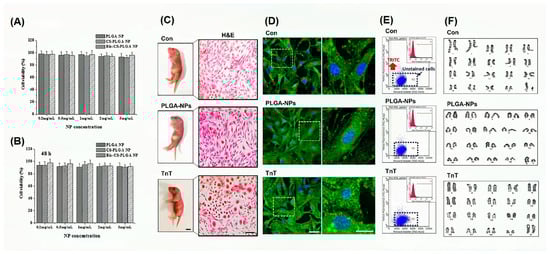 In terms of biological safety, Chen H et al. [73] experimentally evaluated the safety of PLGA, CS-, and Bio-CS-PLGA NPs using cell co-culture. The results showed that the cells had good viability after 24 h and 48 h of culture (Figure 4A,B). The preimplantation embryo is one of the most sensitive systems for assessing toxicity in biological systems. Exposure to factors above threshold levels during embryonic and fetal life may result in a variety of developmental abnormalities in animals and their offspring. Therefore, clarifying the effects of PLGA on embryonic development can more accurately evaluate the biological safety. Kim YS et al. [74] was used to visualize NP delivery into mouse gametes and preimplantation embryos by using TRITC-conjugated PLGA-NP (PLGA-NP), referred to as TRITC-labeled nanotracer (TnT). In this experiment, fluorescence activated cell sorting (FACS) analysis and neonatal mouse fibroblast karyotype analysis were carried out, and the results showed that there was no fluorescence residue of PLGA in the fibroblasts of all groups of live offspring (Figure 4D,E), and the chromosomes were normal (Figure 4F), which proved the reproductive safety of PLGANP (and TnT) for the first time. It does not interfere with the developmental programming of early mouse embryos and their next generations.