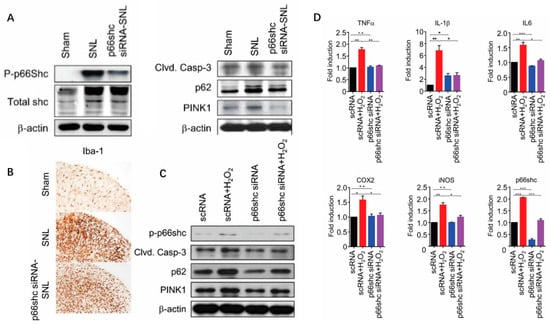 (A) Phosphorylation of p66shc was decreased after treatment with p66shc siRNA-PLGA NPs and SNL-induced increases in cleaved caspase-3, p62, and PINK1 protein levels were significantly attenuated. (B) Microglial activation was reduced in the p66shc siRNA-PLGA NP group compared with the SNL group. Scale bar = 100 μm. (C) Induction of oxidative stress by H2O2 after p66shc knockdown in the HT22 neuronal cell line reduced the protein levels of phosphorylated p66shc, cleaved caspase-3, p62, and PINK1. (D) P66shc knockdown resulted in decreased mRNA levels of proinflammatory mediators in H2O2-induced HT22 cells. Reprinted from ref. [79] under the terms and conditions of the Creative Commons Attribution (CC BY) license (http://creativecommons.org/licenses/by/4.0/). https://doi.org/10.3390/polym12051014 (accessed on 18 June 2024).