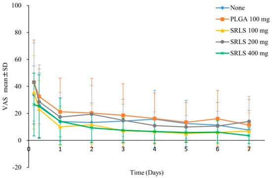 VAS score of postoperative pain. The efficacy or dose response of the sustained-release lidocaine sheet (SRLS) was evaluated by comparing the VAS scores of the unadministered group, the PLGA control group, and the 100 mg, 200 mg, and 400 mg groups of SRLS. Reprinted from ref. [92] under the terms and conditions of the Creative Commons Attribution (CC BY) license (http://creativecommons.org/licenses/by/4.0/). https://doi.org/10.1371/journal.pone.0200059 (accessed on 18 August 2023).