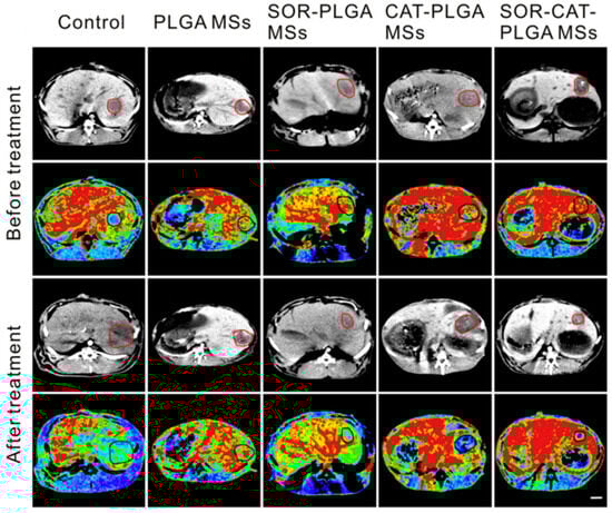 Perfusion CT images of liver tumors in different groups before and after treatment. The red and black circles in the perfusion CT image indicate the liver tumor. The scale bar on the right is 1 cm in length. Reprinted from ref. [105] under the terms and conditions of the Creative Commons Attribution (CC BY) license (http://creativecommons.org/licenses/by/4.0/). https://doi.org/10.1016/j.biopha.2020.110512 (accessed on 25 August 2023).