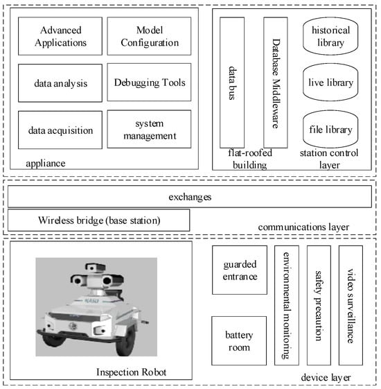 This inspection robot system comprises three distinct layers: the equipment layer, the communication layer, and the station control layer. The equipment layer encompasses robots, charging stations, micro-weather stations, environmental monitoring devices, security systems, fixed video surveillance equipment, and the equipment under inspection. The communication layer consists of wireless base stations, switches, and other communication components. Finally, the station control layer comprises servers, operation terminals, time synchronization equipment, and other control components [78].