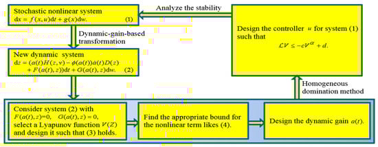 In this paper, we present a new control strategy using the dynamic gain and homogeneous domination method. The strategy covers the following basic steps: Firstly, it needs to introduce a dynamic-gain-based transformation and transform the original system (1) into a new dynamic system (2). Secondly, consider system (2) when select a Lyapunov function and design a controller such that the partial derivative of along the system satisfies the inequality (3). Thirdly, find the appropriate bounds for nonlinear terms like (4). Fourthly, design the dynamic gain to regulate the bounds of nonlinear terms and compute the differential operator of such that it satisfies a form that is convenient for stability analysis. Finally, construct the controller of the original system (1) using the controller and the dynamic-gain-based transformation and analyze the system stability. The diagram of the control strategy is provided in Figure 1.