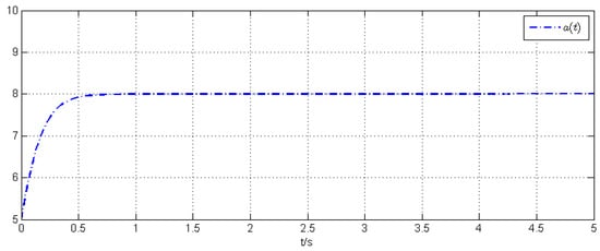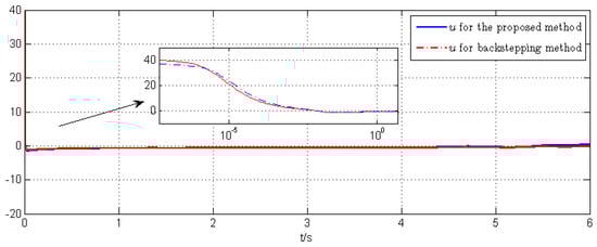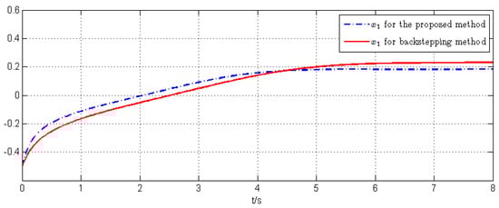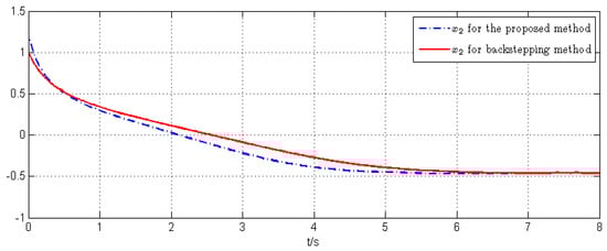 To provide a comparison with the existing method, we also make the simulation using the well-known backstepping control method [,]. The responses are given in Figure 2, Figure 3 and Figure 4 (see the read solid-line curve). From Figure 2 and Figure 3, we see that the proposed method guarantees faster convergence speed. In detail, by using the proposed method, the state converges to a constant at about 4.5 s, which is faster than the speed of the backstepping method (for this method, converges to a constant at about 6.3 s). Additionally, converges to a constant at about 4.8 s under the proposed method. Differently, the backstepping method requires about 6.2 s and is much slower. Figure 4 shows that the amplitude of the proposed controller is a little smaller. It shows that the proposed method has some advantages compared with the backstepping method.