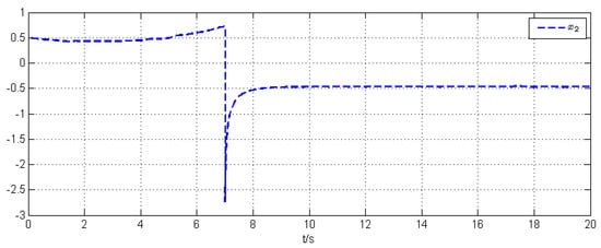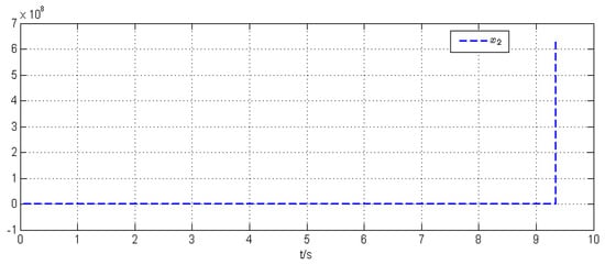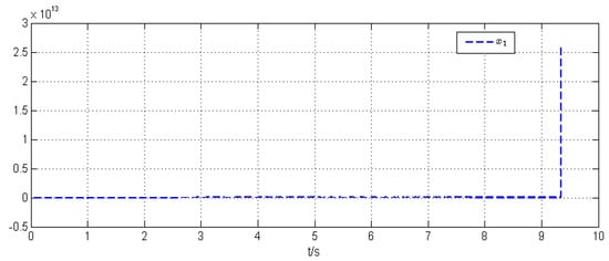 To show how the controller makes the plant more stable, we also plot the results before and after the use of the controller (before the use of the controller means that the system input stays at ; after the use of the controller means that has the values as the designed controller in (18)), see Figure 6 and Figure 7. As shown in Figure 6, before the use of the controller (at 0~7 s), the states will increase from −0.5 to 1.2 and have free motion without regulation of the system control input. After the use of the presented controller (7 s later), the control input has values. The state will be driven back and converge to a fixed constant under the designed controller. From Figure 7, we see that the state has a slow motion before the use of the controller (at 0~7 s). During this period, the state is uncontrolled. When the controller is utilized (7 s later), the system input will follow the values as in (18). State will be pulled to −2.7 from 0.5 and subsequently possess a tendency to converge to −0.5. Figure 6 and Figure 7 show that the system will become unstable without the appropriate controller. Moreover, after the use of the designed controller in this paper, the system states are all guaranteed to be stable. In this example, we also plot the results when there is no controller (see Figure 8 and Figure 9). It shows that the states and will tend to infinity if the system has no effect controller. The above simulation shows that the presented strategy is valid.