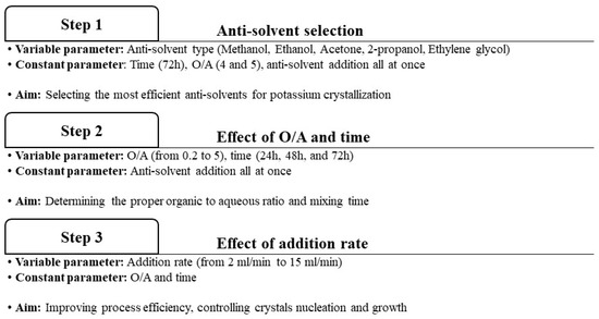 A summary of the main specifications of selected anti-solvents is given in Table 2. It is hard to find an organic solution that meets all the essential properties of a perfect anti-solvent. Each of the anti-solvents chosen is superior to others in a particular property or fulfills various criteria to varying degrees. Aside from that, given the unique characteristics of the K-feldspar leaching solution, it is critical that the efficiency of several anti-solvents with varying qualities is examined in the first step.