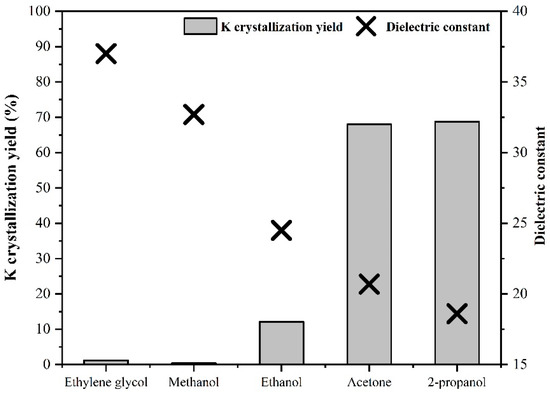 Correlation between K crystallization yield and anti-solvent dielectric constant (O/A = 5, T = 25 °C, and t = 72 h).