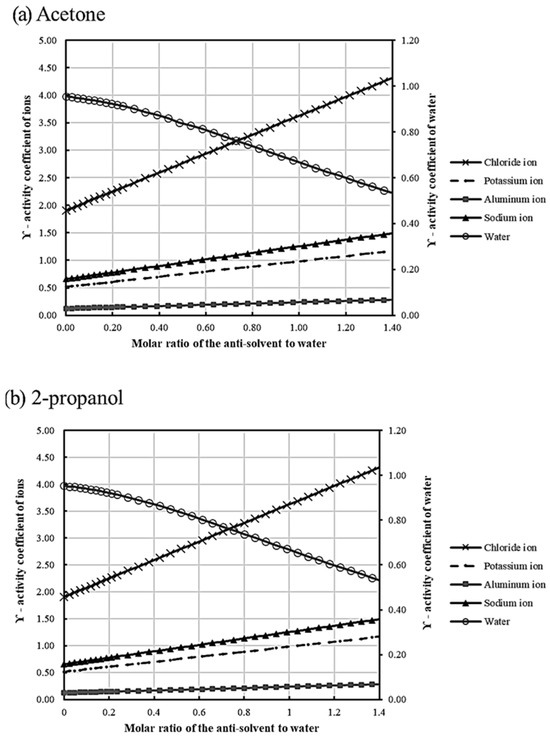 Activity coefficient of water and the PLS component for one liter of the PLS as the function of anti-solvent ratio (a) acetone and (b) 2-propanol (PLS with the chemical composition shown in Table 1, ionic strength = 4.31 mol/kg).