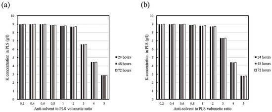 Figure 4a,b demonstrate the effects of antisolvent ratio and time for acetone and 2-propanol, respectively. The figures illustrate the findings of potassium concentration in PLS after crystallization as a function of anti-solvent ratio and time. This was performed in order to demonstrate the ability of anti-solvents to create supersaturation. Both anti-solvents have shown a comparable performance regarding the crystallization of the potassium starting at anti-solvent to PLS volumetric ratios larger 2. By increasing the anti-solvent ratio, the efficiency of potassium recovery increased accordingly. Moreover, a retention time of 24 h seems more than enough for the recovery of potassium. It shall be noted that the crystallization yields of other PLS components were negligible in all the experiments.