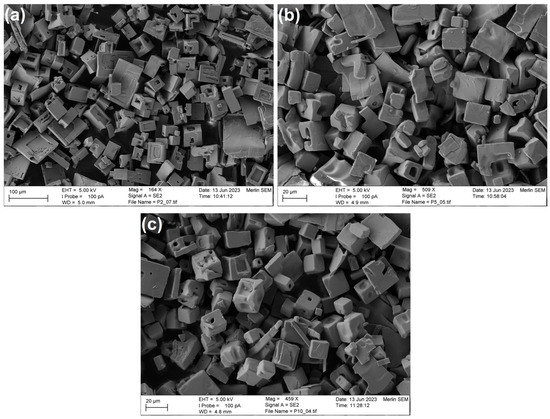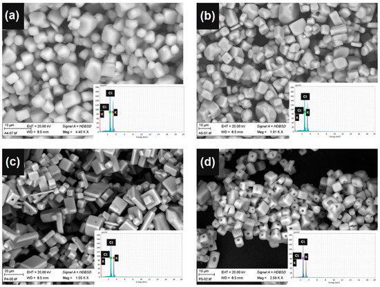 The solids obtained using acetone at the O/A of 4 and 5, and 2-propanol at the O/A of 4 and 5 were analyzed by SEM-EDS. Only potassium and chloride were identified in the samples using SEM-EDS. SEM images of the products are shown in Figure 5. So far, all the results obtained regarding the crystallization yield and the phase composition of the products obtained using acetone and 2-propanol were almost identical. However, differences in the morphology and the crystal size of the potash particles formed under different experimental conditions can be observed. Different investigations have documented the nucleation and growth of potassium chloride as cubic crystals [61,62]. Here too, crystals were mostly cubic. Different crystal sizes may form in a sample due to the solvent in which the crystals are formed. Potash crystals formed in the acetone mixture have mostly kept their cubic form. The diameter of the cubes formed at an acetone to PLS ratio of 4 varies between 3 to 5 microns (Figure 5a) while this parameter varies between 4 to 10 microns at the ratio of 5 (Figure 5b). However, the average size of crystals at two studied anti-solvent ratios is somewhat identical. For 2-propanol, an inverse trend in the crystal size by increasing the anti-solvent ratio can be observed. The crystals formed at the 2-propanol to PLS ratio of 4 are more in the form of rectangular cuboids with diameters ranging from 5 to 15 microns (Figure 5c), while crystals at the 2-propanol to PLS ratio of 5 are cubic at a diameter ranging from 3 to 5 microns with a hollow center (Figure 5d). The observation of the hollow-centered cubes indicates a defect in the crystal structure. This phenomenon can be attributed to the Schottky defect, which is further discussed in Section 3.3.3. The chemical composition of the products is shown in Table 5, indicating just a trace of contaminants in the obtained products. All the products have a purity of over 99.9%.