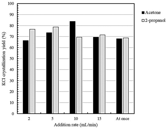 The addition rate affects the induction time and the metastable zone width. Increasing the addition rate of anti-solvent decreases the induction time [66]. Induction time can be defined as a measure of the ability of the solution to remain in the state of metastable equilibrium [66,67]. When the induction time is passed, the nucleation of the stable crystals starts. Accordingly, the induction time can be considered inversely proportional to the nucleation rate. A shorter induction time is desirable for higher nucleation rates. Typically, faster addition of anti-solvent generates higher supersaturation, which may increase the crystallization yield [37]. In the case of potash crystallization using acetone, the crystallization yield was constantly improved by increasing the addition rate from 2 mL/min to 10 mL/min. However, the crystallization yield peaked at the addition rate of 10 mL/min then a decrease in the crystallization yield was observed when increasing the addition rate. A similar trend in the experiments conducted by 2-propanol was also observed, in which the potash recovery peaked at the addition rate of 5 mL/min.