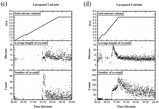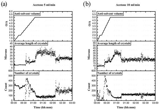 The number of crystals and the average crystal length as a function of time for acetone and 2-propanol are shown in Figure 7. The organic-to-aqueous ratio at various stages is also shown in this figure to illustrate the effect of the progressive addition of anti-solvents on the count and size of the particles. The highest potash recoveries were achieved with acetone addition rates of 5 mL/min and 10 mL/min and 2-propanol addition rates of 2 mL/min and 5 mL/min, respectively.