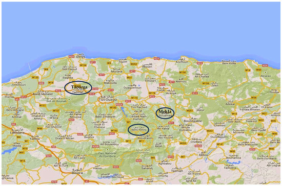 This study examined extra virgin olive oil (EVOO) of the ‘Chemlal’ variety of the olive-growing region. The olive oils were obtained from young (5–15 years) and old (centenarians) olive trees, in three localities of Kabylia (Algeria), namely Beni Yenni (wilaya of Tizi Ouzou at an altitude of 820 m), Mekla (wilaya of Tizi-Ouzou at an altitude of 566 m) and Taourga (wilaya of Boumerdes at an altitude of 340 m) (Figure 1). In winter, the average temperature range in Beni Yenni was 2–11 °C, in Taourga 4–13 °C and in Mekla 5–14 °C.