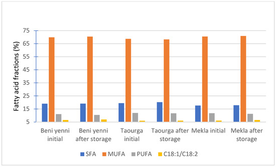 Evolution of fatty acid fractions (%) in different regions during storage (at 12 months).