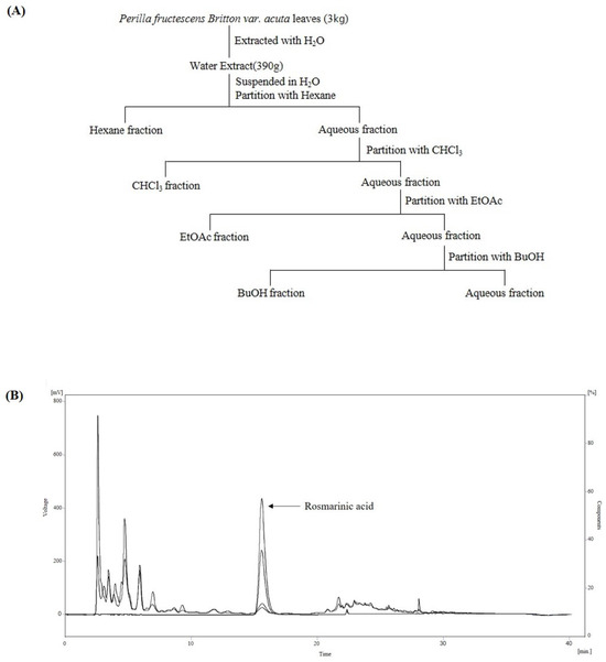 Fractionated process of aqueous leaves extracts from Perilla fructescens and high-performance liquid chromatography analysis (A) fractionation procedures for PF are outlined through a schematic diagram. PF was dissolved in water and partitioned with hexane, CHCl3, EtOAc, and BuOH. (B) High-performance liquid chromatography chromatograms of Rosmarinic acid of PF extract.